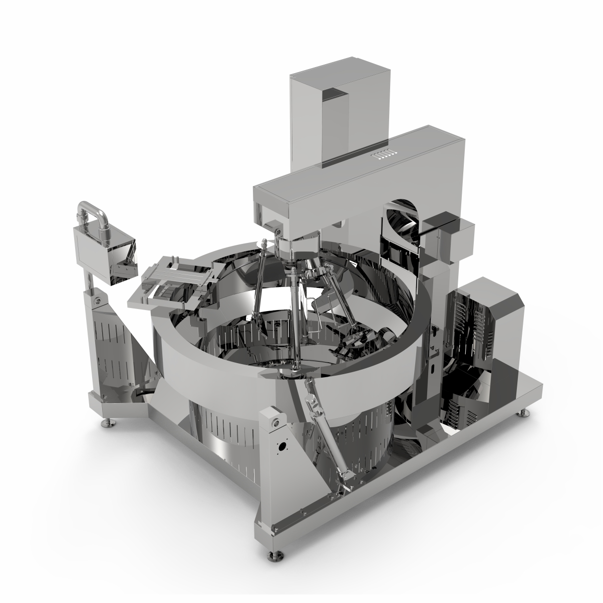该锅主体为SUS304不锈钢材质,物料炒制采⽤PLC⾃动控制各炒制流程⼯艺参数,液压翻转出料,搭配⼈机界⾯, 操作简单,稳定可靠,采⽤新型炉盘设计。